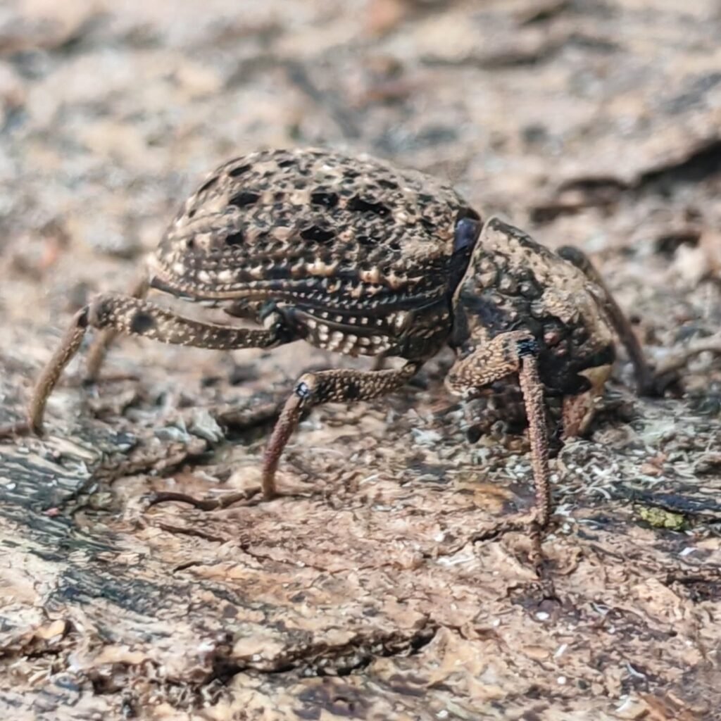 This image features a Japanese giant weevil (Sipalinus gigas) navigating the coarse bark of a log. Its prominent snout is adapted for boring into wood, a behavior linked to feeding or egg-laying. The weevil’s rugged, bark-like texture provides excellent camouflage, blending seamlessly with its environment.